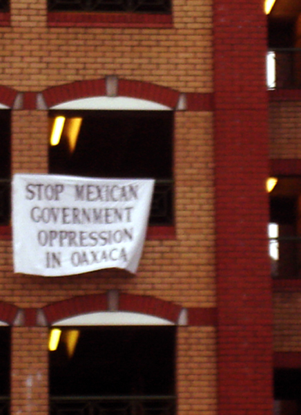 but other parts of the world. The banner later found itself hanging from multi-story car park.