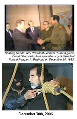 National Security Archive: Shaking Hands with Saddam Hussein | Did the US Support The Gassing Of The Kurds? Evidence Suggests US Republicans Did? | Robert Fisk: A dictator created then destroyed by America | Juan Cole: Top Ten Ways the US Enabled Saddam Hussein | Wikipedia: Saddam Hussein | An Expanded Brief History of Iraq | America Helped Make A Monster | If Saddam Guilty, Rumsfeld Guilty | Robert Fisk: What the US President wants us to forget