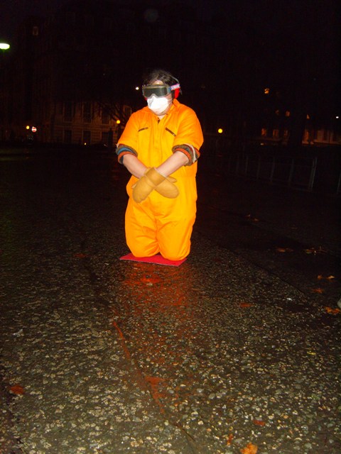 Martin and Scott took turns kneeling in full Gitmo sensory deprivation kit. The vigil opened and closed with a circle, we heard from Caoimhe recently returned from living and working in recently bombed Southern Lebanon, Ciaron recently acquitted of nonviolent disarmament of a U.S. war plane in ireland www.peaceontrial.com , Scott formerly of the U.S. Air Force, people with experiences of nonviolent resistance to the "War on Terror", work with refugees fleeing war and incarceration and detention.