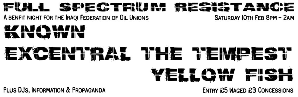 £5/3 donation on the door - all proceeds go to the Iraqi Federation of Oil Unions in their fight against the privatisation of Iraq's oil.