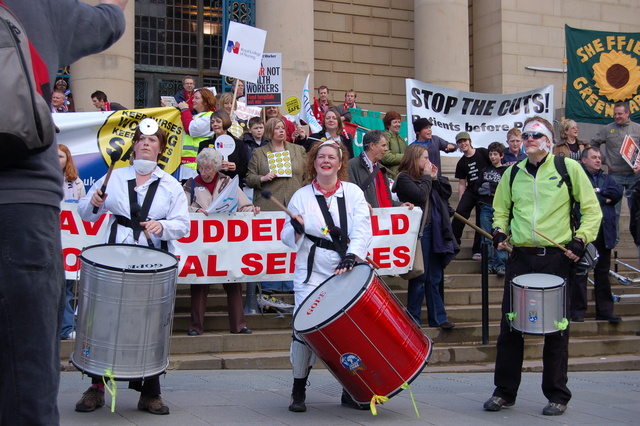 http://www.sheffieldsamba.org.uk/ and slogans shouted included "welfare not warfare" and "beds not bombs". There are more photos here: