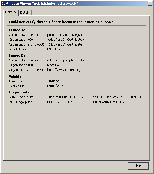 https://www.indymedia.org.uk/en/2007/03/364390.html#security You have the right cert, the SHA1 and MD5 fingerprints match, this means nobody has hijacked your session.