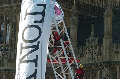Greenpeace volunteers have scaled a crane next to Big Ben and hung a huge banner from it declaring 'TONY loves WMD'.