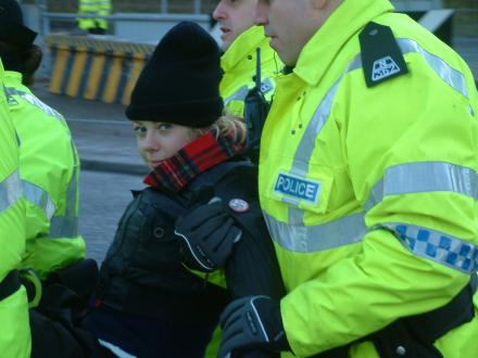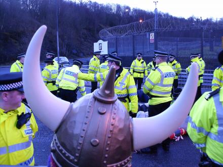 A twelve strong group from York, dressed as Vikings, have successfully blockaded both entrances to the Faslane nuclear submarine base. The coordinated action completely closed the base for half an hour this morning. Four men and eight women were arrested in the peaceful protest.