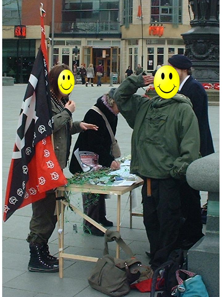 Anti-Recruitment centre proved a roaring success with over sixty people officially de-enlisted in less than two hours!! Stunt enjoyed a very good response from the general public (young and old, drunk and sober) and even solidarity among a few ex-squaddies. At times, the allusion proved a bit too convincing for some early victims of the St. Patrick's Day revelries (in spite of the giant anarcho-syndicalist flag) but after some considered explanation we got the message through and were even treated to some drunken sing-a-longs. Every bit of AF prop we could find was given away, including most of our uniforms/costumes. Oh yeah ... and we confused the hell out of some Mormons.