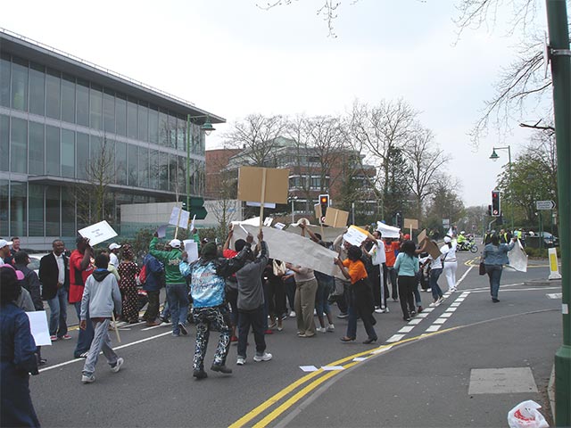 Around 150 protesters brought traffic to a standstill during a demonstration outside the Home Office's immigration centre in Solihull yesterday. Police had to close Homer Road for more than two hours during the protest by the Congolese community about the deportation of families back to the war-torn country. Babies were among the group which waved placards and sang songs during the lunchtime protest. Police had cordoned off an area in front of Sandford House immigration centre but as the number of protesters grew, they were shepherded into the car park.