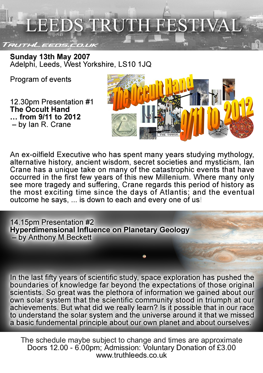 Our thought re the Leeds Truth Festivalwas to get 'at the back' of what's going on, which if you dig enough, entails you entering new realities, if you're willing to go there.