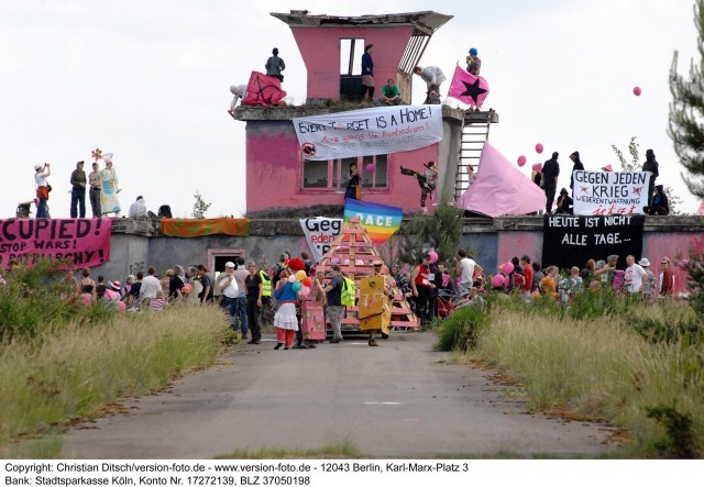 The 142 square kilometre Bombodrom (80 km north of Berlin) was used as a bombing range by the Soviet army for 40 years. Since 1992 the German military has been trying to take over the facility to establish an air-ground bombing range for German, EU and NATO forces to conduct combined operations of air and ground forces. In protesting at the site the demonstrators are trying to highlight the connection between the G8 and war and to clearly show their rejection and resistance to war (for more see