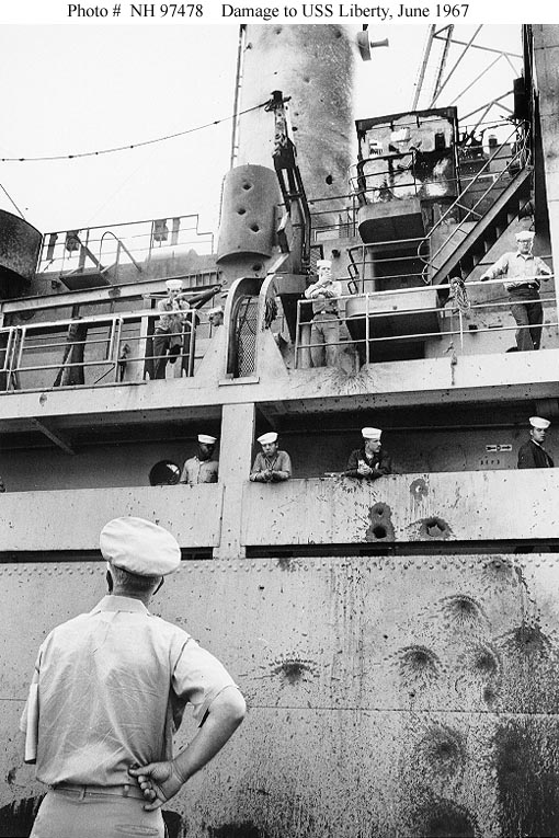 As the war intensified, the Liberty sent a request to the fleet headquarters requesting an escort. Requesrt denied, by Admiral William Martin. The Liberty moved alone to a position in international waters about 13 miles from the shore at El Arish, then under furious siege by the IDF.