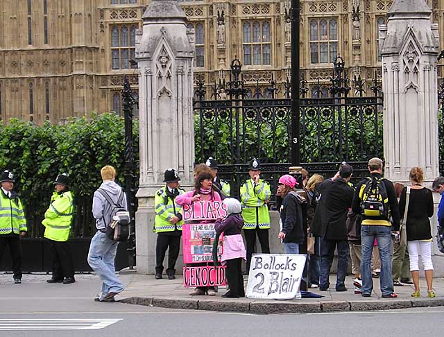 Barbara and Charity decided to move across the road with their placards to the gates of Parliament itself, despite a phalanx of police there. Apart from some good natured banter none of the police seemed to object to this. Similarly with the pair of cops who turned up near the unauthorised Peace Camp and then moved on.