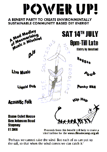 Proceeds from this benefit will help to make a wind turbine for the Camp for Climate Action www.climatecamp.org.uk