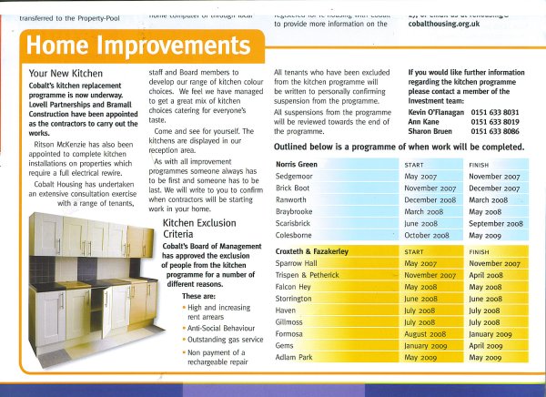 In their latest newsletter,published here.They have decided to penalise tenents who are in arrears,and other reasons.In a planned upgrading of the old disgusting kitchens in their properties,often infested with ants.They intend to exclude tenents who owe rent,have a family member who as an asbo,owe them for repairs or have not payed their gas bill.Incidently how they know a tenent has not payed thier gas bill would mean the gas company is giving out personal customer information.This social housing company of self appointed charitable businesmen/women are behaving like some victorian poor law organisation.The recent installation of double glazing is of poor quality and imbecilic workmanship.Frames are not fixed to the struture in some propert'y.And fixing holes left unfilled make the point of double glazing obsolete.It seems more of Cobalts budget is spent infiltrating the police.Supplying cash for the Cobalt police force.But be that as it may to actually make people to continue to live in rundown homes and to deny upgrades to them on the grounds of not being able to pay domestic bills is nothing short of slum property landlord tactics or sending the Beagle round.If they are allowed to get away with it you can expect it to spread to non social housing.I hope some of the mainstream read this and take it up.