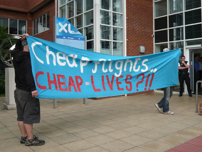 The Home Office/Border and Immigration Agency are holding a tribunal in September to review its policy on deporting asylum seekers to the Congo, a tribunal that has constantly been pushed back, increasing the fear and uncertainty of Congolese asylum seeking safety in this country. The Congo is subject to resource wars, fuelled by corporate interests, that kill 1,200 per week according to the UN. XL Airways profits from cheap flights that contribute to climate chaos increasing the number of environmental refugees in the world. XL also profit from deportation charter flights of people who have fled resource wars in the Congo. Cheap flights... cheap lives?!!