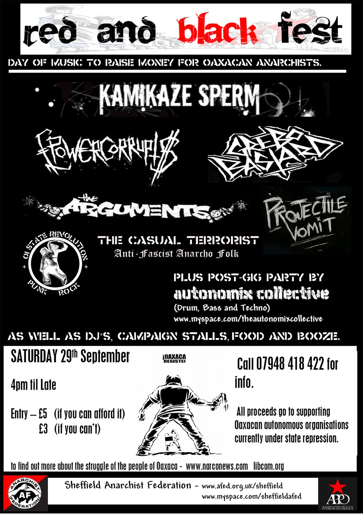 Starting @ 4pm and finishing late, call the info line on 07948 418 422 for directions closer to the date. The entrance is £5 or £3 if your skint; all proceeds go to supporting Oaxacan activists. To find out more about the struggle of the people of Oaxaca have a look at www.narconews.com, www.libcom.org or indymedia's very own oaxaca section.