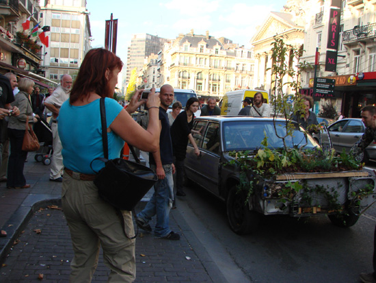 Also for mobility week the Brussels based environmental group, Auto-nomie presented an environmentally friendly car, truly an environmentally friendly car. Zero emissions is a thing of the past, this car has negative emissions. If you care about the planet but still want a car that turns heads this is the model for you and the conversion is cheap and easy. Take out the engine replace is with a few wheelbarrows full of good quality soil and plant your favorite fruits and vegetables. Cruising through the streets of Brussels in a customized car like no other is the way to go. When your friends get tired of pushing what better way of revitalizing them than a tasty car grown strawberry. The car was on display in central Brussels all last week.