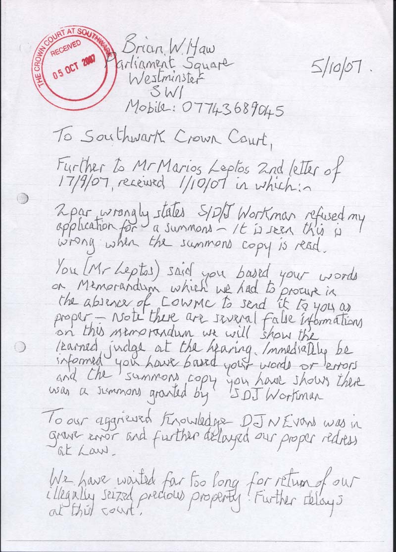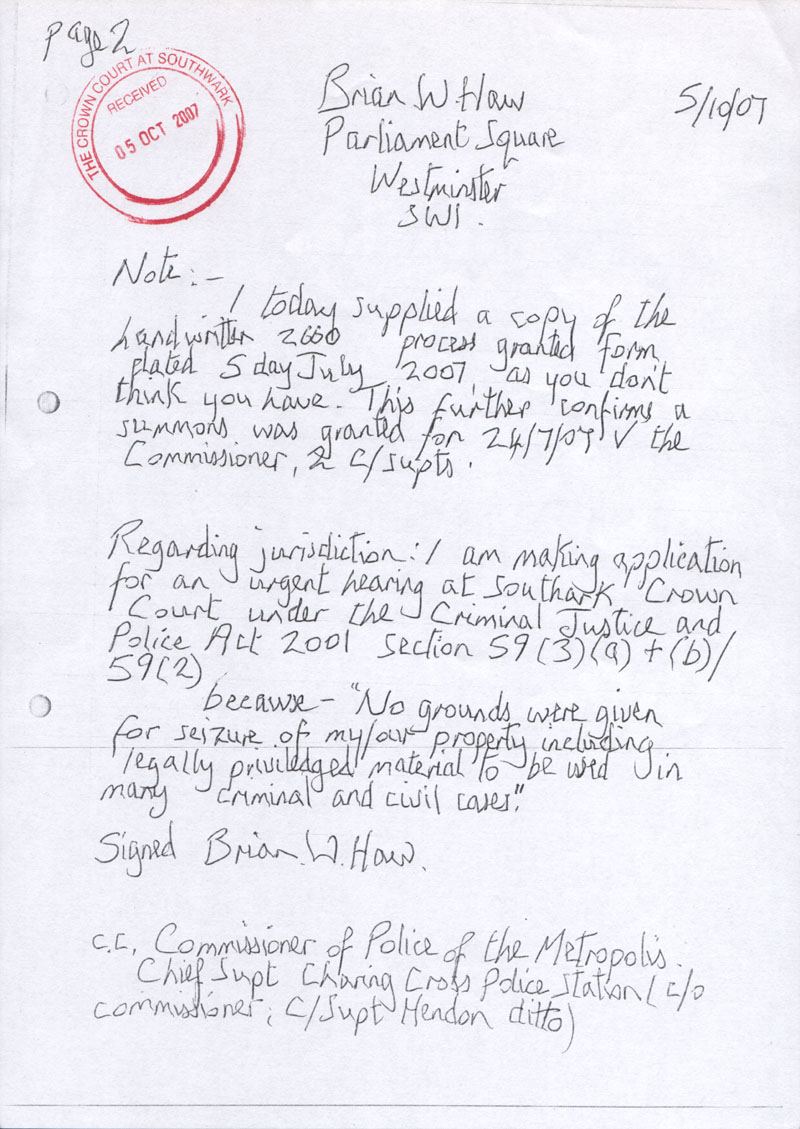 Today, 5th October 2007, I hereby serve upon you a copy of an application made under section 59(2) Criminal Justice and Police Act 2001, at Southwark Crown Court relating to Mr Brian Haw & Co.'s property stolen by you/your henchmen on 23rd May 2006.