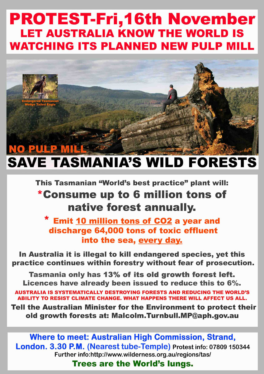 Protest in London to coincide with Australian elections - tell Australia's politicians that the proposed new pulp mill in Northern Tasmania will be disastrous for the environment.