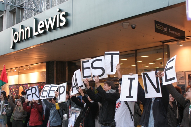 Finally a lively demonstration was held outside John Lewis because they sell Caterpillar products. Caterpillar’s armoured bulldozers have been used by the Israeli army for the destruction of thousands of Palestinian homes, schools, wells and olive groves, and have also been used in the construction of the Apartheid Wall.