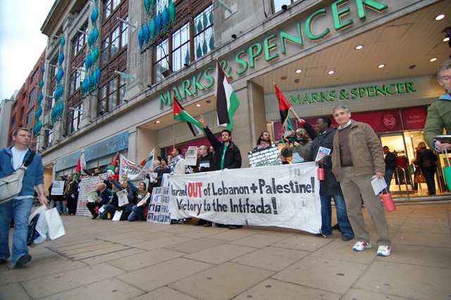 • Join our campaign in support of the Palestinian Liberation Struggle. There is a demonstration every Thursday, 6 – 8 pm outside Marks & Spencer’s flagship store on Oxford Street (Marble Arch end), London. We urge everyone to boycott M&S as a focus of the boycott Israeli goods campaign in order to dent the profits of the British retailing company that has repeatedly stated their support for Israel and thus send a shock wave through the whole establishment.