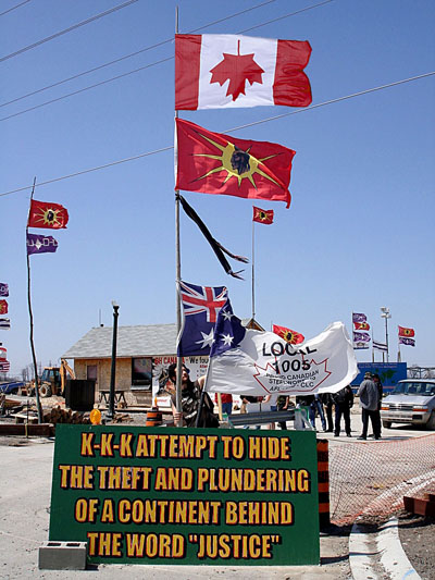 Faced with a growing population and more encroachments, the Confederacy took action to preserve and expand it's territory onto land that has been stolen by Canada. It is this land that I am writing from. We have occupied this land since Feburary 28 2006. It has been named Kanonhstaton which is Mohawk for "the Protected Place" and protected it is. We have defended it from a large raid by the Ontario Provincial Police as well as from regular attacks from Fascists. The fascists are practically given the go ahead from Canadian police who have done little to nothing to stop the known fascist organizers who regularly attack us here. The attacks range from racialized harassment, rock throwing, fire work shotting, threats with hunting riffles and terrorism which has destroyed our main meeting place. A friend of mine was shot in the face with a pellet gun from a military reservist that we later caught and handed over to Canadian police. The police released him without charges. Despite the risk to our physical and emotional well being, we continue to hold the land non-violently.