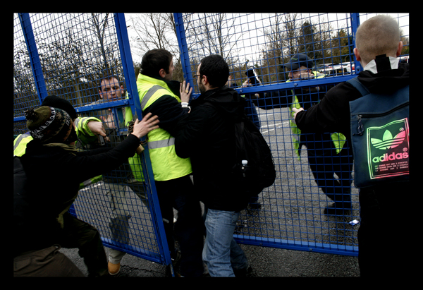 As protesters arrived on site and attempted to close the main gate, 10 security guards and site manager Amos Or quickly emerged from the warehouse. One protester was punched in the face, and the guards then locked the gate to prevent the protestors from entering.