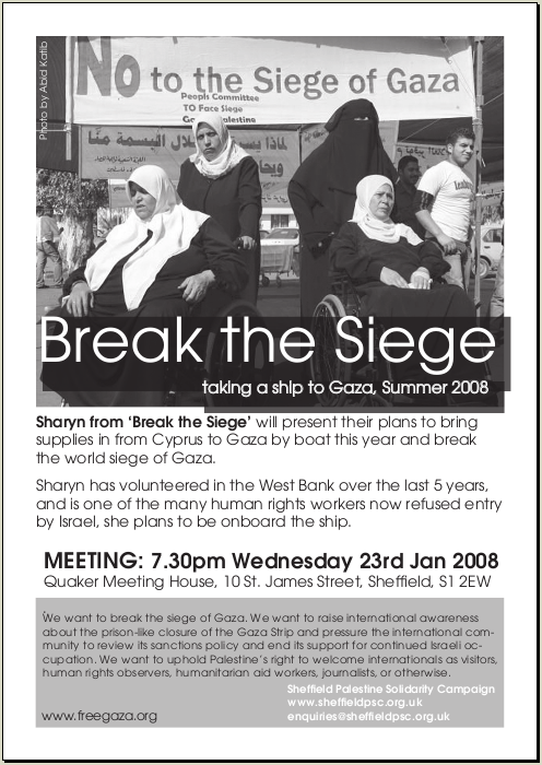 Public meeting on the 'Break the Siege' boat to Gaza; Sharyn from the 'Break the Siege' organisation will give a presentation on plans for an international group of volunteers to take a boat, loaded with supplies from Cyprus to Gaza. Sharyn has volunteered in the West Bank over the last 5 years, and is one of the many human rights workers now refused entry by Israel, she plans to be onboard the ship. The Free Gaza project aims to raise international awareness about the prison like closure of Gaza and call for an end for international sanctions and an end to Israeli occupation.