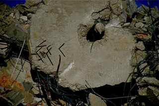 Along a deserted road we reach the remains of a home, now a mass of broken concrete and twisted metal.