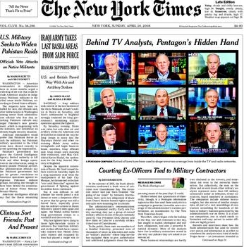 An investigation by the New York Times has revealed "a Pentagon information apparatus" which uses military 'analysts' in a campaign to generate favourable news coverage of the Bush administration's wars on terrorism and Iraq. The front page feature by David Barstow comes after the paper successfully sued the Defense Department, under the Freedom of Information Act, to gain access to 8,000 pages of e-mail messages, transcripts and records describing years of private briefings, trips to Iraq and Guantánamo and an extensive Pentagon talking points operation.