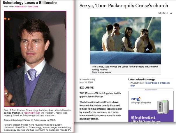 We have showbiz celebrity nutters like Tom Cruise, John Travolta and other actors who's careers are failing, becoming high ranking members of this evil cult, getting rich by suckering in fools who are easily brainwashed by these stalkers who will spend days following those who speak out about them, dissapprove of them or are not easily taken in by their lies.