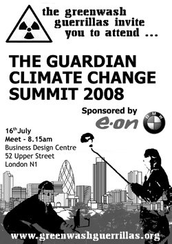 Don a white painter’s suit and come on down to the Business Design Centre in Islington to join a crack team of greenwash detectors. We will be cordoning off the area and warning summit delegates about the high levels of toxic greenwash leaking from the building. (We suspect its source to be E.ON Managing Director Bob Taylor, who’s got a top spot on the panel.) To get a sense of what the demo will be like, check out the Greenwash Guerrillas in action -