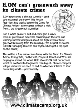 http://risingtide.org.uk/node/284 (see small versions below). Just two weeks before the Camp for Climate Action at Kingsnorth, E.ON are sponsoring a climate summit designed to help industry leaders ‘keep stakeholders engaged’. Just like their plans for 'clean coal' at Kingsnorth, this is greenwash of the highest toxicity: a laughable-if-it-weren't-so-tragic attempt to distract us from the fact that E.ON are planning to build the first coal-fired power station in the UK for over thirty years. And that, in a time of unprecedented climate crisis, is an unacceptable insanity.