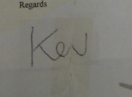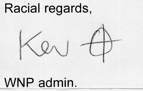 http://www.indymedia.org.uk/en/2008/07/403065.html and as with the first thread it contains an image of a letter supposedly written by Kevin Watmough to Gerry Gable of 'Searchlight'. Now I don't know if this letter is genuine or not, but I do know when I'm reading bollocks, and the cod analysis by some posters of this supposed letter amounts to that. Of course, even the fash themselves have got in on the act. McDermody claims on her vile blog that the signature on this letter is nothing like Watmough's Really? As it happens, I have a copy of Watmough's signature (above) and while it isn't completely identical to the signature on the 'Searchlight' letter, it certainly appears to have been written by the same person.