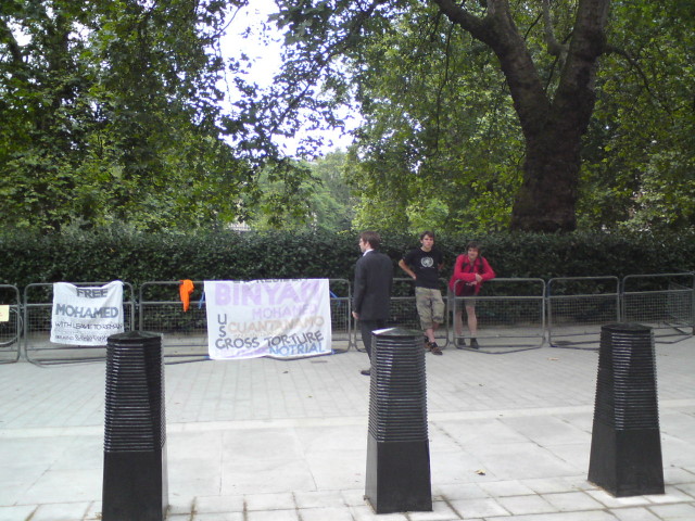 About 10 people, including Andy Worthington, the author of The Guantánamo Files and a staff member of Reprieve, joined the start of the vigil. The police attempted to stop and search a freelance journalist filming the event as the American Embassy feels paranoid about anyone taking pictures of its building or staff. The police were generally amicable.