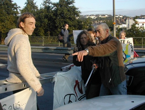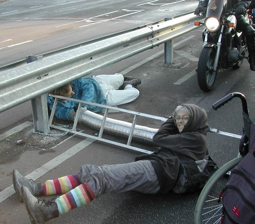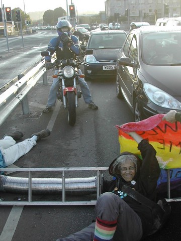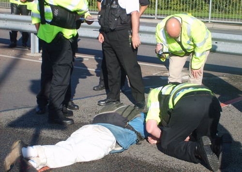After releasing himself from an arm lock-on tube (which had been passed through one ladder and also chained to the central crash barrier), Daniel Viesnik, 33, from London got up and then lay down again on the red line marking the limit of the Ministry of Defence property. He was subsequently joined by Irene Willis. After ignoring police requests to move, Mr Viesnik was arrested and carried away to a van. He was taken to Charles Cross police station and held for around three hours before being charged with obstruction of the highway and released. He was bailed to appear before Plymouth Magistrates’ on 5th September.