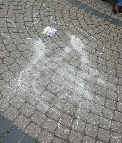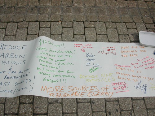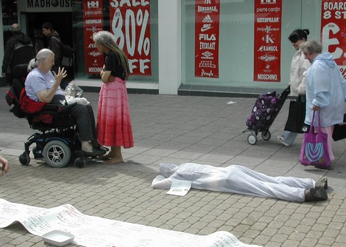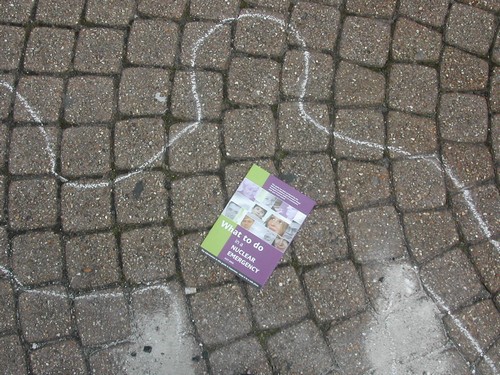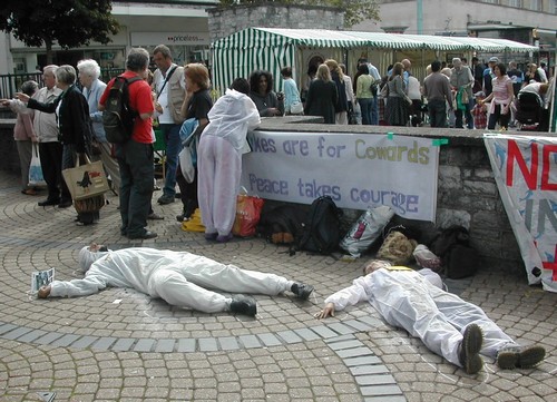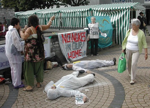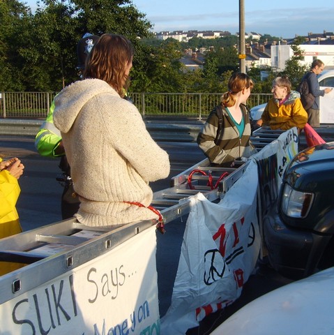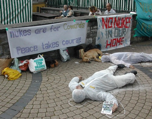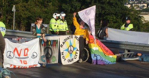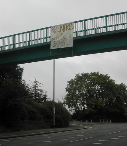 On Saturday morning, the group tied anti-Trident banners to prominent bridges and roundabouts on roads going into Plymouth. Later, in the city centre, they dressed themselves in white ‘radiation suits’ and some of them attracted the attention of passers-by with a ‘die-in’, their ‘corpses’ sprinkled with ‘nuclear fallout’ ash. Others leafleted shoppers and engaged interested locals and soldiers from the nearby Territorial Army centre in dialogue about the nuclear menace on their doorstep and proposals to turn the site into a nuclear submarine graveyard.
