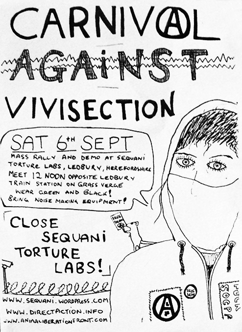 At Sequani itself the police have generally been fair and polite since being sued. There have been 2 arrests one for writing in the dust (criminal damage), one for uttering the word murderer out of earshot of the actual murderers. Speaking for myself I do not think that the police have finished with us. Of course anyone who does something like smashing a window will be arrested but I think that since the Crown Court trial somewhere high ranking officers and CPS lawyers are learning from their mistakes and conspiring to stop protests at Sequani. They want to make it water tight this time and are simply biding their time after all promises have been made and far from stopping protests they have stirred up a hornets nest. They must be furious and even if protestors just turned up every week and stood silently outside the lab we would all still be at risk anyway. I feel that I am just waiting for the next police raid and have a choice to either stop speaking out altogether or to take some risks by carrying on. I have seen much on Indymedia about how loads of people will be arrested on this carnival, how risky it will be to attend etc. People might be arrested but my view is that those who are in a position where they do not want to be arrested will soon have to abandon all protest anyway. People have to make a choice about how far they are prepared to go and that choice must be respected by others, encouraging veganism is one of the most important roles there are right now (however the phrase “are you or have you ever been vegan?” springs to mind).