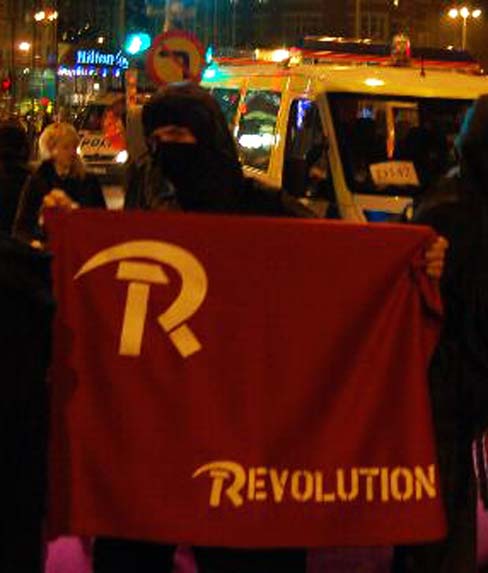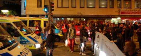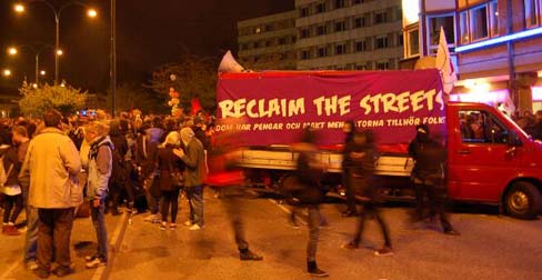 Over the the weekend, the Swedish tabloid press headlined: "Krawall och Kaos!" or "Riot and Chaos!". This was referring to a "Reclaim the Streets" party which had gone through Malmö's city centre on Friday evening. The approximately 2,000 participants danced to hip-hop and techno - and because the Swedish autonomists seem somewhat more class struggle-oriented than their German counterparts, the whole party took place behind a banner with the slogan "Klass mot Klass" ("class again class"). Some people sprayed graffiti along the road and a window pane of the bank SEB was smashed - i.e. it was hardly the mass riot that the press had been warning about for days! The police, who were present, remained surprisingly reticent. "If they were to attack, then everything would get much, much worse" said an ESF organizer about the police tactics.