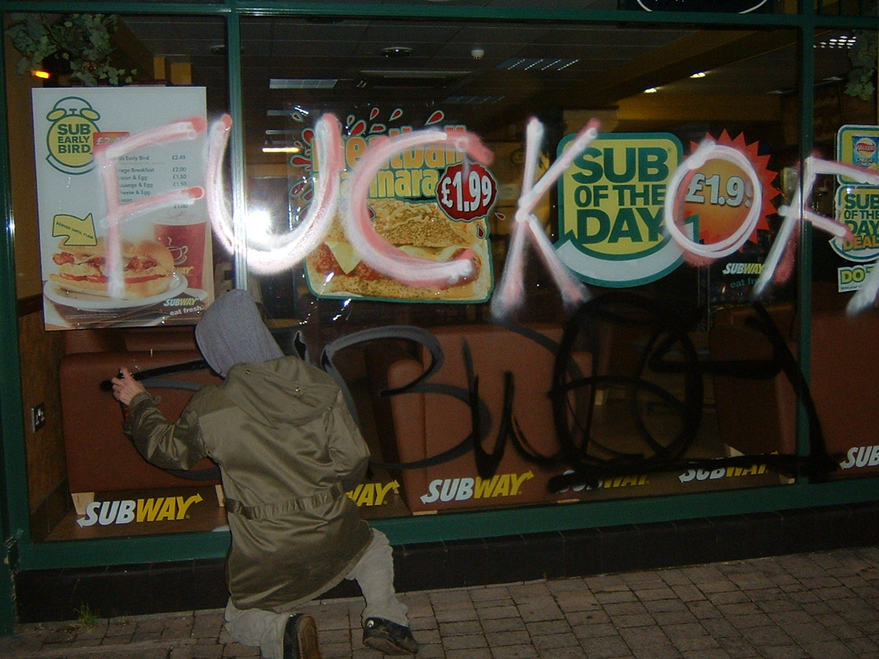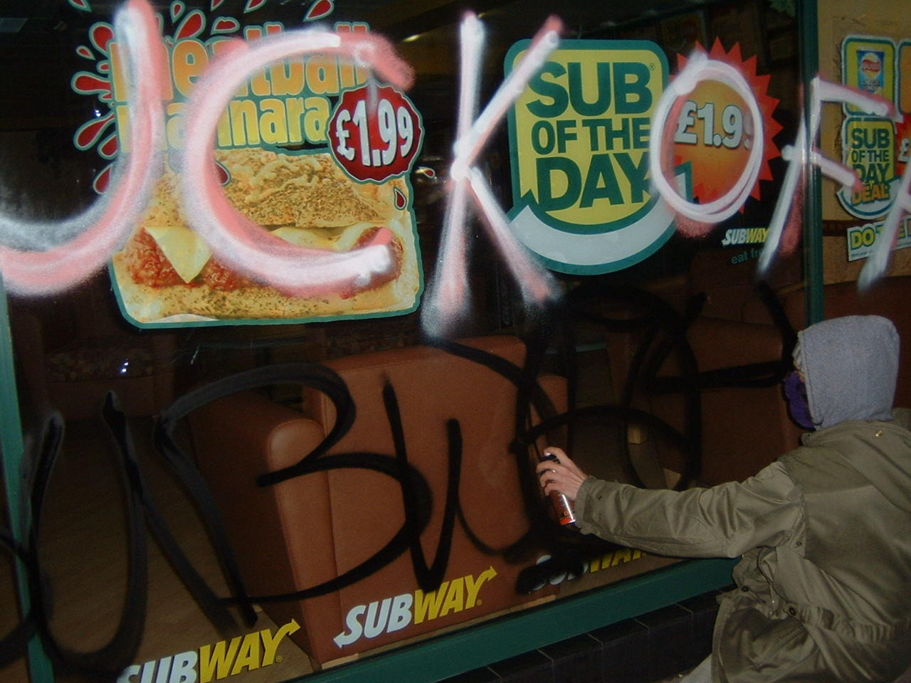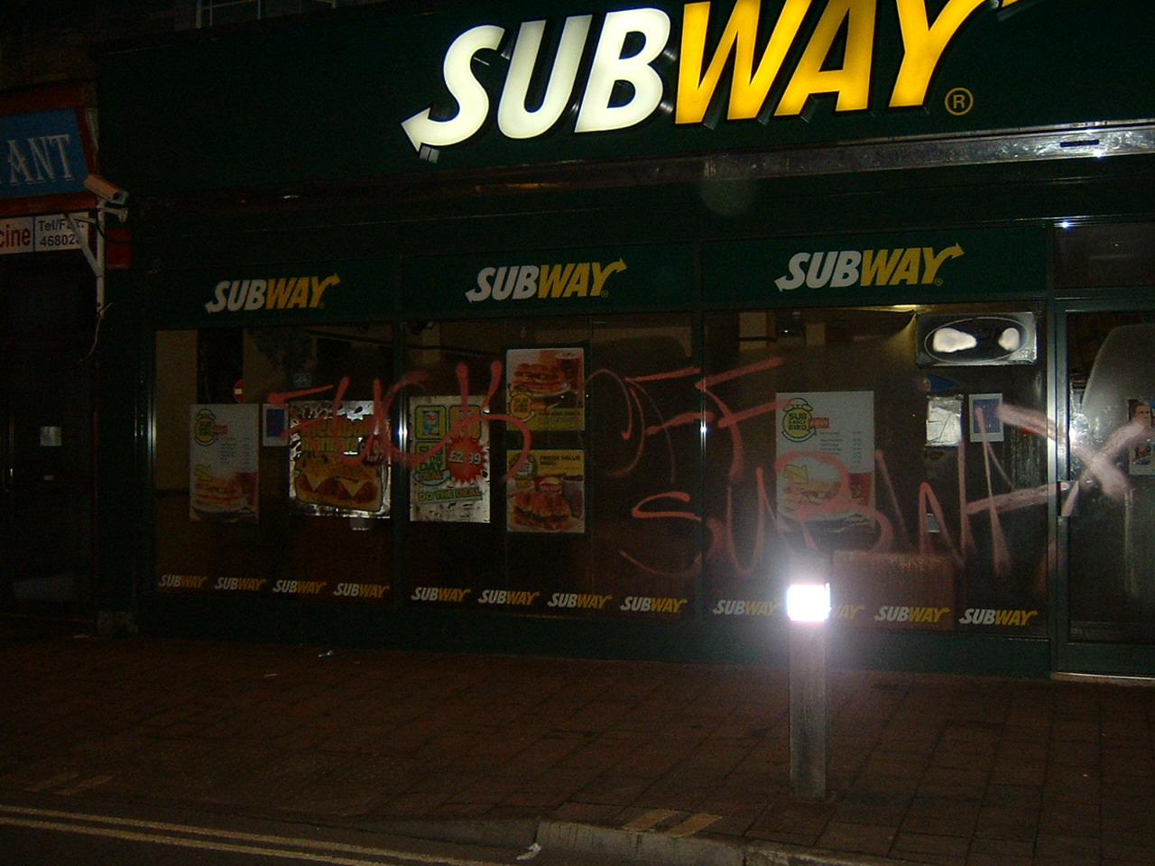 Conerned over the increasing homogenisation of Cowley road these two subways were damaged non-violently. lets keep Cowley road special and unique. we already have tesco, subway, costa coffee and threshers. no more.