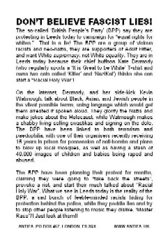 Taunted by counter-demonstrators on both sides, laughed at by the people of Leeds, the rag-tag BPP outfit huddled together and no doubt had a good moan about Rap music, immigration, ‘reds’, and the state of the world in general. Not a single fascist leaflet was given out, nor did anyone hear a word the idiots had to say. (They later abandoned their ‘National Congress’.)