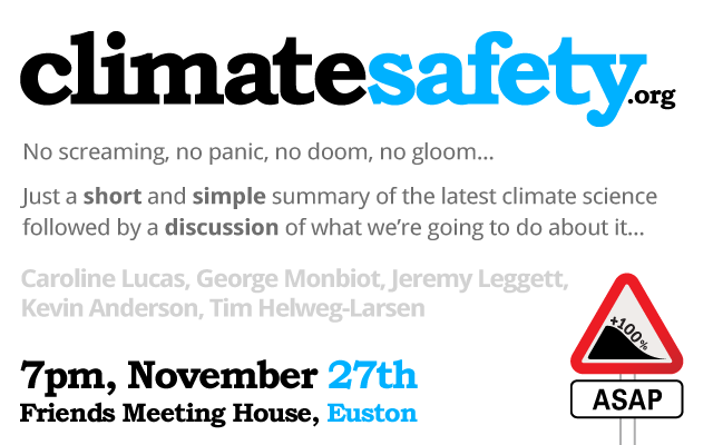 "Climate Safety" warns that even our current policy response, a commitment to 80% carbon cuts by 2050, does not match up to the scale of the challenge. Join us to discuss finding a way to get beyond "politics-as-usual" and achieve a full, emergency response.