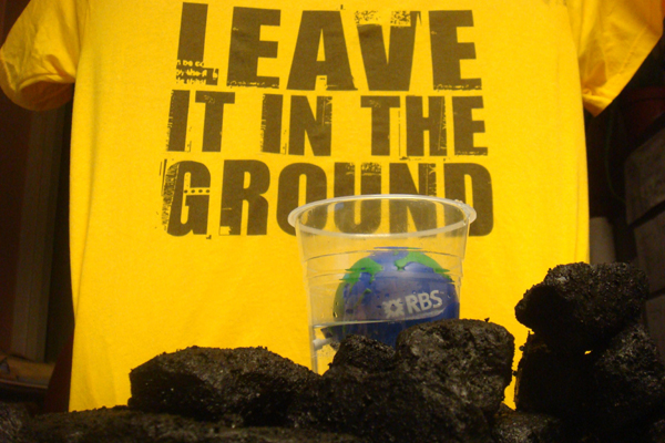 RBS insisted that they do hold a concern for the environment as shown by their investment in renewable technology. However, the Leave it in the Ground crew responded that this was massively counterbalanced by their active encouragement and financing of fossil fuel exploration. For example, RBS client E-On's investment in renewables accounts for just 2% of their portfolio whilst coal accounts for 61%. (www.eon-uk.com/generation/191.aspx)