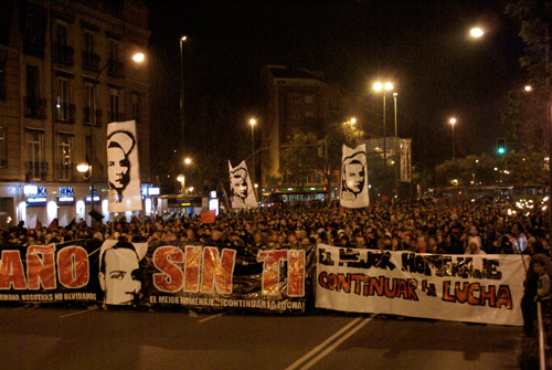 The demonstration "Carlos, one year without you" marked the first anniversary of the 11th of November 2007, when Carlos Javier Palomino, a 16 year old active antifascist activist in the Madrid circles, was murdered from the stab wounds caused by the fascist Josué Estébanez de la Hija in Madrid's Legazpi tube station.