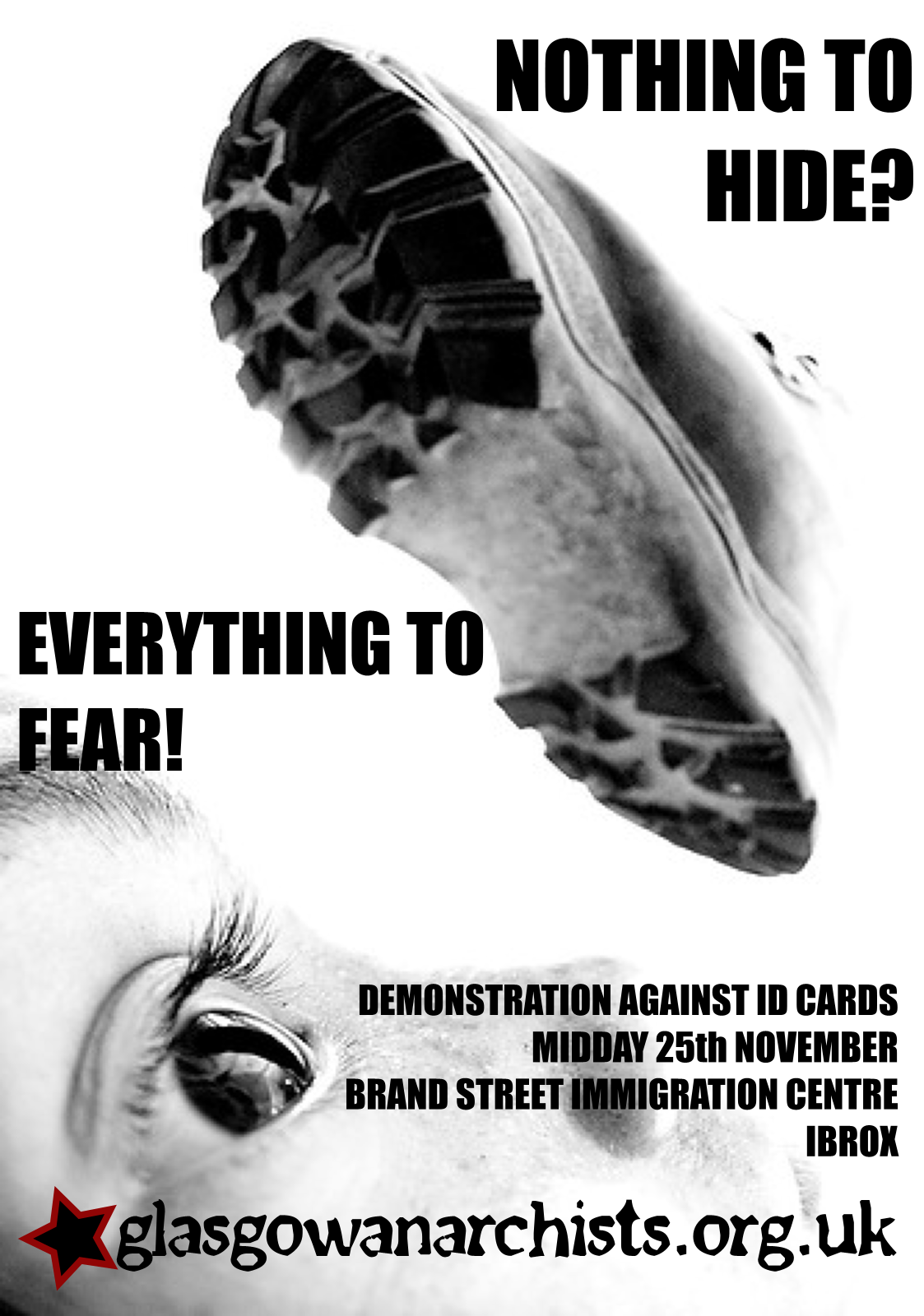 Join us on the 25th of November in demonstration against the implementation of ID cards. We will gather outside the Home Office @ Festival Court, Brand Street, Ibrox from midday on the 25th.