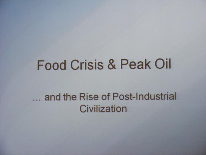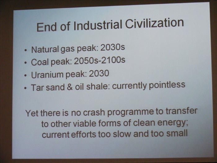 http://dieoff.org/page224.htm ) and the imminent acute global energy crisis are described. He points out that there is currently the capacity to feed the whole of the planets population -- the current problem is one of distribution. He talks about alternative and renewable energy, the financial system and how we might use what we have to plant a seed to create a better, post-industrial society.