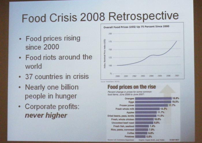 http://en.wikipedia.org/wiki/The_War_on_Freedom In the lecture he points out that 1 billion people are currently hungry -- one 1/6 of the worlds population. He asks who controls food and provides figures for some key parts of the global food production process -- 6 companies control 85% trade in grain, 3 control 85% of the banana trade, 4 control 84% of US grain production, etc. The green revolution, soil erosion, climate change, global warming, drought are all covered.