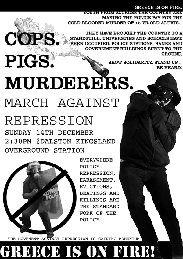 We are calling the Demo in Hackney as this is an area where police repression is a problem faced by many of the community - unlike the leafy streets surrounding the Greek embassy in Holland Park.
