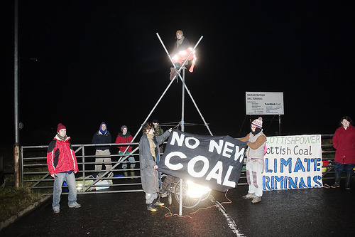 Beth Whelan, the campaigner perched on the scaffolding tripod, said: “Local authorities, the Scottish government and companies such as Scottish Coal and Scottish Power are ignoring the scientific evidence on climate change. We have to take responsibility for our climate and our future, and stop the coal industry and its expansion. This is what we doing today: acting responsibly”.