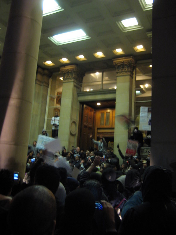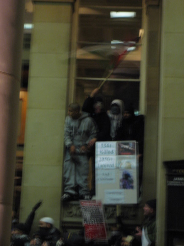 After about half an hour, the crowd had become increasingly fired up, and some people at the front of the crowd began to move off in the direction of New Street. Between 25 and 30 police attempted to block the protest, but they were outnumbered and pushed back by the crowd who were determined not to let the police prevent them from exercising their democratic right to protest. Eyewitness reports state that younger Muslim members of the crowd were targeted by the police, culminating in two youths being dragged off and harassed although they had not committed any offence. The protest continued to march up New Street, and at various points the police tried to stop the crowd again, but were repeatedly pushed out the way. Meanwhile, the protest numbers had swelled to around 1000 people as passers-by joined in. At the top of New Street an additional police phalanx was waiting for the protestors in an attempt to funnel the crowd towards the Council House where a pre-planned Stop The War Coalition meeting was to be held; earlier STWC organisers were seen liaising with the police. As the crowd approached the police phalanx there were shouts of “Whose Streets? Our Streets!”. The crowd surged towards the doors of the Council House and emotions were running high. As people were about to rush the doors, Salma Yaqoob and Ger Francis (Respect party councillor and organiser) blocked the entrance, raised their hands, and urged people not to enter. People were shouting “Free Free Palestine!”, then Salma Yaqoob shouted over a megaphone for people to be calm and quiet so a ‘dignified’ discussion could take place. The crowd booed as most people had not come to the protest to sit down and listen to a panel of opportunistic politicians. Salma continued to shout that people should be ‘quiet, orderly, and disciplined’, so that ‘all the councillors can know what people feel about Palestine’, in case they did not know already. She then asked for one minute’s silence for the victims of Palestine, despite the mood of the crowd clearly not wanting to be quiet! Many people in the crowd shouted “Allāhu Akbar” which translates as “God is great” in Arabic. When the crowd continued to shout, Salma told everyone off for being ‘selfish’ and that some people were ‘spoiling it’, an irony seemingly lost on her as she attempted to control what she saw as an ‘unruly mob’ for the ends of the membership recruitment drive of the STWC/Respect axis. She asked everyone to proceed into the Council House in an ‘orderly and disciplined way’, and to “not crush each other for goodness sake”. At this point I recall the lyrics of an Asian Dub Foundation song where they warned of “lightning conductors” in political activism; opportunists who try to subdue people’s outrage and pacify people into apathy, conducting their energy into the ground. Many of the people who attended were not activists, and I could not think of a worse introduction to the world of fighting for social change than the disempowering practice of pleading with powerless council politicians to fulfil our demands, although it benefitted those with party political agendas. Soon the Council House was full, and several hundred people were left outside, the mood of the protest killed.
