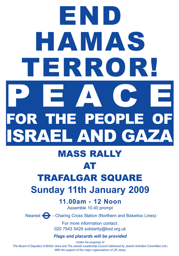 This double messaging is very clever. It allows them to mobilze those defending israel's actions as well as those who are campaigning for a cease fire. More sneaky still, placards etc are provided by the organisers so they get to set the final messaging, along with their press departments media blitz.