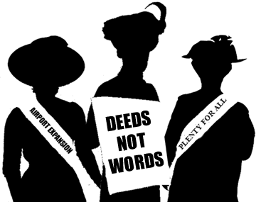 their bricks in notes that read: 'NO THIRD RUNWAY, THE SUFFRA-JETS ARE